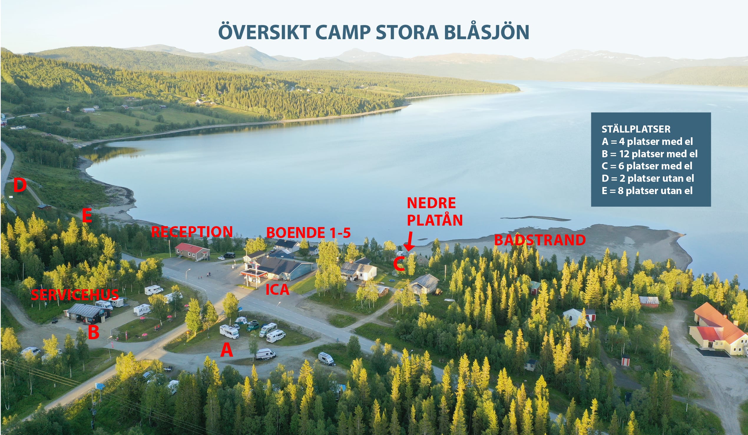 Vi erbjuder 30 ställplatser, alla med el (inte område D & E) och tillgång till servicehuset med dusch och toalett. Här finns plats även för dig som reser med tält eller för de som vill bo bekvämt i någon av våra övriga boendealternativ.